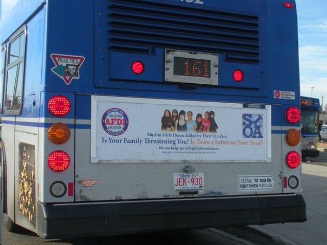 b) another agent in Canada engineers it so that signs on Edmonton buses – signs that provide information on how young women living in fear of what the Agents of I.S.L.A.M. call “Honor Killings” can seek legal help. This one is the most nefarious item on I.S.L.A.M.’s agenda so far on this series. Canada’s politicians are depicted as craven cowards for caving in to pressure from one of I.S.L.A.M.’s front groups and taking the signs down.