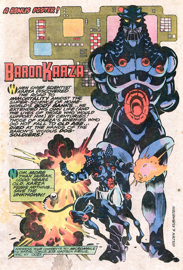 Story arc-wise The Micronauts fell into the same trap that many of the Star Wars Expanded Universe novels fell into (and which the movie series may soon fall into). After the rebellion against Baron Karza was successful in having him overthrown the series became aimless, so Karza repeatedly returned to reconquer the Microverse. The stories became all about stopping Baron Karza or eventually, having to overthrow him again when he returned to power in the Sometimes the Good Guys Lose storyline which also saw the slaughter of lots of supporting toy-figures.
