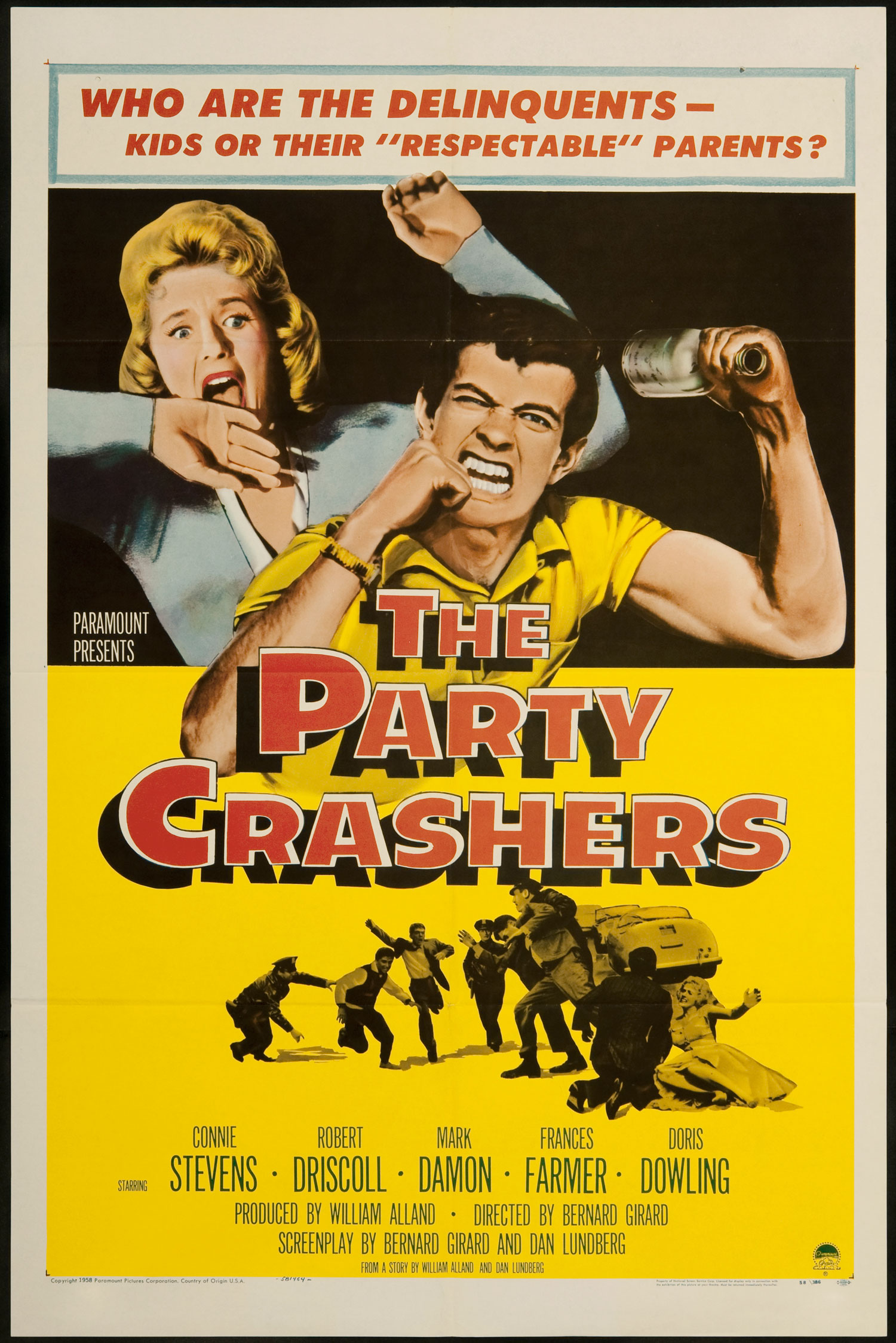 Movie: The Party Crashers is one of the most enjoyably campy Juvenile Delinquent films of the 1950s. The title gang are J.D.’s who crash parties at the homes of the wealthy, help themselves to food, booze and women then trash the place. A “good girl” is torn between her bland boyfriend and the repulsive leader of The Party Crashers. All the teens are spoiled and annoying – all the adults are alcoholics and bloated rich pigs. Lots of fun!