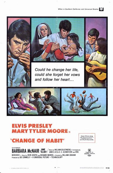 THE MOVIE: Change of Habit is a movie that was practically MADE to be ridiculed. You’ve gotElvis Presley, never exactly a master thespian, his sideburns, which out-perform him in this flick and Mary Tyler Moore as a nun torn between her vows and her growing attraction to The King.