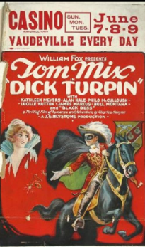DICK TURPIN (1925) – Western star Tom Mix took a break from his Wild West movies by starring in this highly romanticized film about the real-life English thief and highway robber Dick Turpin. John G. Blystone directed the movie for Fox Film Corporation. Tom swapped his six-guns and rifles for a sword and pistols in this flick.
