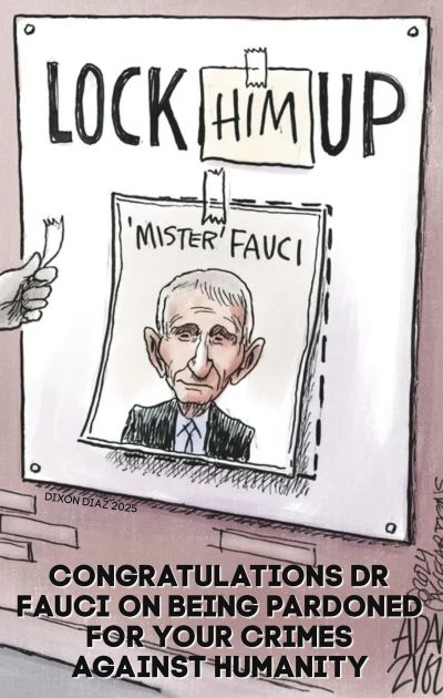 Thank you! Yes, Fauci is, the congratulations on the poster in that cartoon are sarcastic, not sincere. Is that what you meant or am I not understanding your question? I want to be able to answer you if it’s no bother.