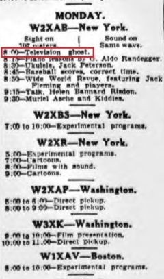 In addition to The Television Ghost, there were other programs from that year, most from station W2XAB. Among them was Exhibition Boxing, a show that presented amateur boxers fighting in a small, non-regulation ring; the self-explanatory Hints for Swimmers hosted by Charles Speer; and Television Today, which featured academic lectures, pantomimes, short plays and magician Richard Kenny.