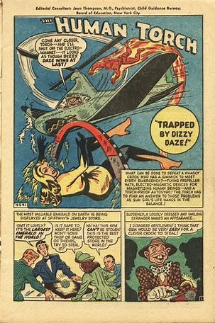 Naturally the Human Torch feigns cooperation, then turns the tables. He and Sun Girl proceed to shoot Daze’s aircraft out of the sky to crash in a nearby lake from which the police fish him out.