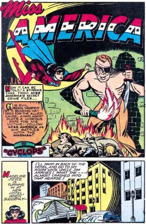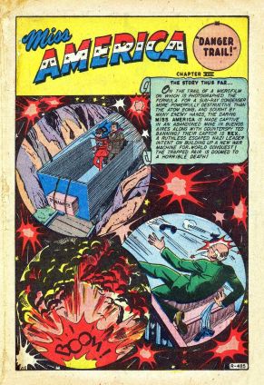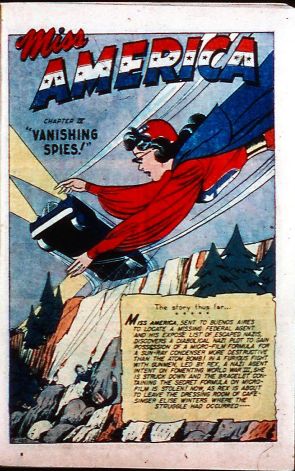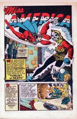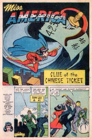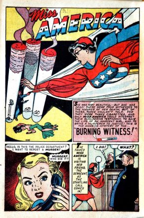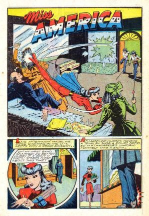 As Miss America, she uses her super hearing to learn that two lodge guests named Page and Morrow are up to something nefarious. Next, she calls upon her far-off police contacts in New York City to research Page and Morrow. It turns out they and their dead victim were fellow crooks fighting over $100,000 (equal to $1,773,000 in 2025) in criminal proceeds. Miss America puts the kibosh on them.