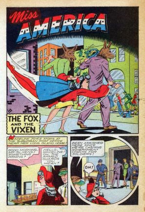 Miss America captures Vixen when the couple rob a post office. The villainess refuses to offer information about the Fox. Our heroine gets the cops to let Vixen escape so she can follow her to the hideout she shares with the Fox. In the final battle, Fox sprays bullets at Miss America, who of course is not harmed but she captures Fox and shows him his gunfire killed Vixen.