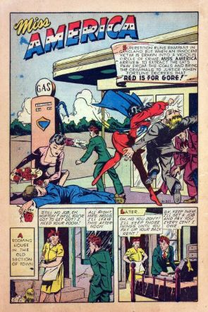 Our main character shuts down Miss Bluebeard’s operations, which involve her marrying older men and then getting their insurance proceeds after they seem to die from natural causes. Miss America also saves the woman’s latest husband and another insurance investigator from being killed, then turns Miss Bluebeard and her underlings over to the police.