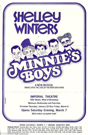 The soundtrack album from Minnie’s Boys, though not hailed as a masterpiece, was far more popular than the comedy bits. Another bad sign in a show that should have had the funny zing of the Marx Brothers’ early Broadway hits of the 1920s, not to mention their films.