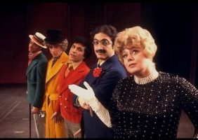 This cul de sac is cleared up when Groucho changes his mind and comes back to rejoin the family business after all. Okay, I get that it’s necessary to emphasize how Groucho’s once-in-a-century talent was vital to the success of the Marx Brothers but to save time in this stage show maybe they should have just had Groucho quit right after Albee throws them out, not when they’ve just gotten renewed hope from the Walnut Theater turn of events.