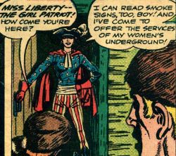 Origin: Nurse Bess Lynn decided she could further help the American Rebel cause in Massachusetts and its department of Maine by employing her other skills in the costumed identity of Miss Liberty. Bess was a blonde but wore a black wig in her costumed form.