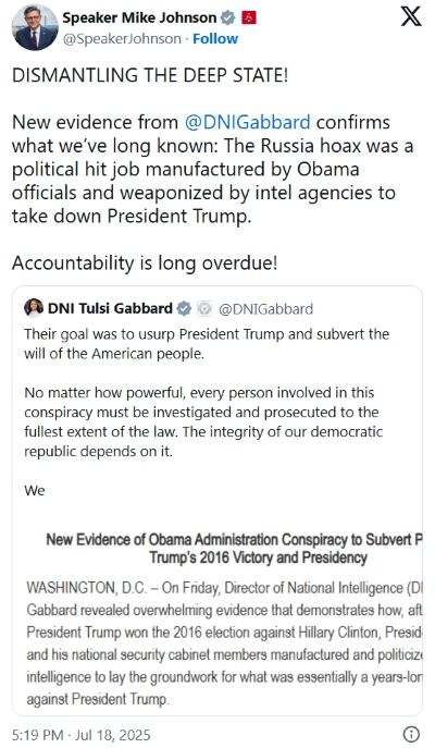 DNI TULSI GABBARD BLOWS OPEN THE MOUNTAIN OF EVIDENCE REGARDING OBAMA AND HIS THREE-LETTER AGENCIES’ RUSSIAGATE HOAX TO TRY CRIPPLING THE INCOMING DONALD TRUMP ADMINISTRATION IN 2016. Plenty of names, facts and dates plus charts which resemble those from Organized Crime trials. Very appropriate for documenting the cesspool called America’s political establishment and for reaffirming what we’ve all known for years.