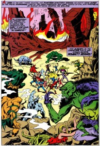 Now, with their traditional battle cry of “Avengers Assemble” the rest of our heroes attack Dormammu. The Lord of the Dark Dimension transforms the stone slab beneath the feet of the approaching Avengers into quicksand. Those Avengers who cannot fly – Captain America, the Black Panther, the Swordsman and Mantis – begin sinking into the bog.
