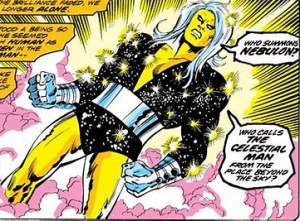 After awhile, Nebulon is so tired from the lengthy battle that he loses enough concentration that he drops the illusion in which the Celestial Man has cloaked himself. Instead of a bipedal humanoid of almost angelic appearance, Nebulon is really a hideous, scaly, tentacled being who is clearly intended for an underwater habitat, hence his demand to flood the world.
