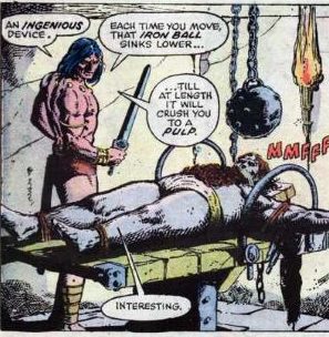As Techotl perishes, Conan hurries on as silently as he can. He surreptitiously reenters the Tecuhltli part of the city and soon comes across Olmec where Tascela left him – bound in chains to a torture rack with a slowly lowering iron ball over his head.