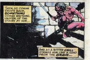 Hearing pursuit, the trio begin running as quickly as they dare in the darkened city. At length, a certain slithering, writhing something that can’t be made out overtakes them. Conan lets Valeria and Techotl race onward while he stays to fight whatever it is.