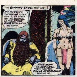 NOTE: Techotl is counting the slain Burning Skull among the “five dead.” Conan is wary of the “madman” Techotl and Valeria explains that he and his people live at one end of the strange city, while the people they just killed are of a faction who live at the other end.