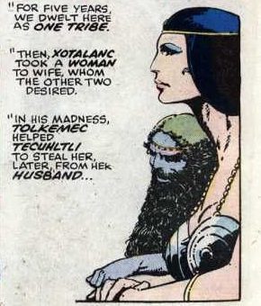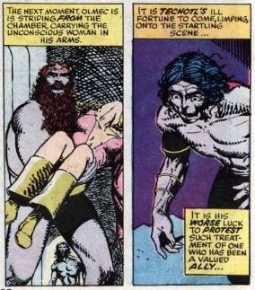 He carries her off in his arms and when Techotl objects to treating a valued ally that way, Olmec overpowers him and stabs him in the back before going on his way with the unconscious Valeria.