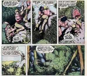 Conan and Valeria hurriedly climb back up the crag she just came down from, barely getting to safety ahead of the dragon – cleverly drawn to resemble a stegosaurus as if some of the species are still around but are called “dragons” in Howard’s fictional Hyborian Age of so long ago.