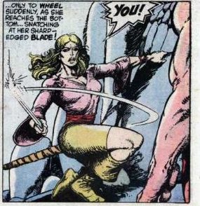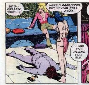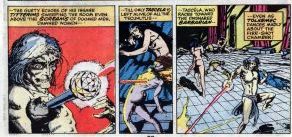 Tascela draws nearer to the altar with a sacrificial knife in her hand. Conan rushes forward to save the bound but conscious Valeria only for one of Tascela’s booby traps – a bear-trap, oddly enough – to sink its steel teeth into one of Conan’s legs.