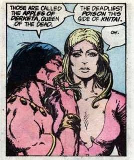 Valeria spots apples growing on the branches of a nearby tree, but Conan points out that they are poisonous Apples of Derketa – potent enough to swiftly kill people. This gives Conan an idea. He fashions a crude spear from the tree branches and dips the spear in the juices of the Apples of Derketa.