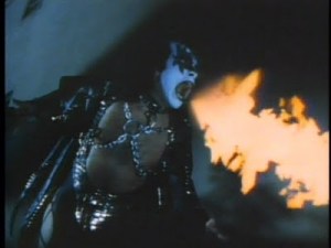 Gene Simmons – The Demon – can really shoot flames from his mouth according to this movie, but in a couple of instances this effect is rendered so poorly you can VERY easily see where the techies did their business (so to speak). Gene fares the worst of the band in this movie. The filmmakers distorted his voice with a chintzy reverb effect to try to make him sound spooky and add to his “demonic” air, but the end result is that you can barely understand a word he says. He also growls like an animal at times.