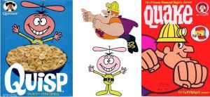 Ward, famous for Bullwinkle and Rocky plus other characters, quasi-cannibalized his own Moon Men figures from his most famous series. The result was Quisp, a zany alien, as the name and mascot for one of the new cereals. For the other cereal, Ward came up with Quake, a muscular miner in a hardhat.
