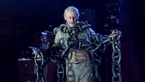 EBENEZER SCROOGE – Nicholas Farrell is one of the best Scrooges I’ve seen in filmed stage versions. Even an obsessive Christmas Carol fan like me didn’t see any particular weakness in his performance. Much of the dialogue comes straight from the Dickens novel and Farrell speaks it as fluidly as someone from 1843 would. As a bonus, Scrooge gets to see the ghostly hearse in this Carol.