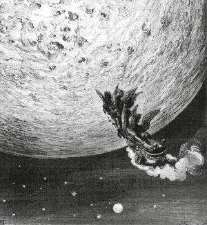 The next morning our hero joined St. John in his spacious chariot in which the Saint’s flying horses transported the pair of them to the moon. On their mission for God the duo flew above the towns and cities of the moon and landed in the Valley of Lost Things.