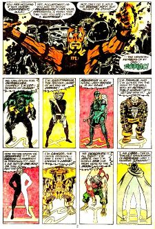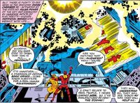 Wonder Man (post-death, now an ionic revenant) is on monitor duty that day in Avengers Mansion and he mistakes the three Defenders for intruders so he fights them until it all gets straightened out. Our heroes learn what readers already knew about Scorpio I.