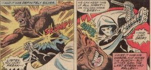 At this early stage we are told that Moon Knight’s super-strength comes from having been bitten by the Jack Russell werewolf in L.A. but all the silver in his costume and weaponry prevented him from becoming a werewolf himself. He instead gained superstrength ranging from Spider-Man levels during the nights of the Full Moon to lower levels during the other phases of the moon all the way down to just normal human strength on nights with no moon.