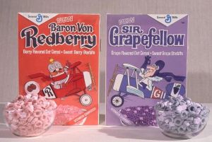 General Mills tried replicating their Monster Cereal success with a pair of cartoon World War One flying aces as mascots for two new cereals. Sir Grapefellow was a stiff upper lip British fighter pilot whose cereal featured oats and grape-flavored marshmallows called Starbits. Baron Von Redberry, clearly based on Germany’s Red Baron, represented a cereal with oats and berry-flavored marshmallows/ Starbits.