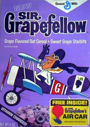 Continuing the war of words were Sir Grapefellow’s promise of “an aerodynamic breakfast” and his greeting “Pip, pip, and all that, Sir Grapefellow here to introduce my new grape-flavored cereal with sweet Starbits. It’s fortified with 8 vitamins and iron, too! Ummmmm. Simply smashing.”