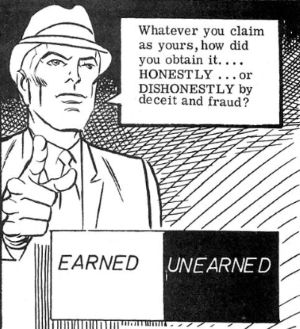 INITIATION OF FORCE/ RETALIATION TO FORCE – Ditko and Mr. A deal with authoritarian leftist movements using the philosophy “Confiscate private property and wealth. They stole it from those who never owned anything. Whatever belonged to someone in particular now belongs to everybody.”