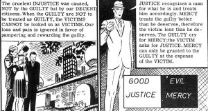 Justice/ Mercy features the young driver behind a hit and run slaying being shown more mercy because of his unfortunate life circumstances than the victim’s loved ones are shown by the system. The driver is set free and gloats that “they don’t give a care for the victim, it’s the guilty they’re anxious to protect.”