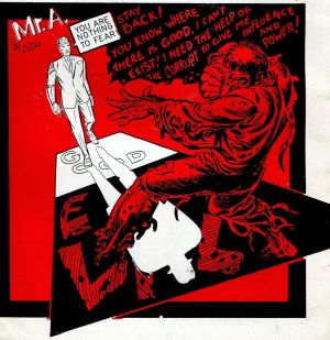 The humanoid/ primate hybrid the Aggressor wears a necklace from which dangles a crucifix with a fist on the lower extremity of the cross. Mr. A condemns religious leaders who defend violent criminals by invoking moral relativism to avoid making any distinctions between good and evil.