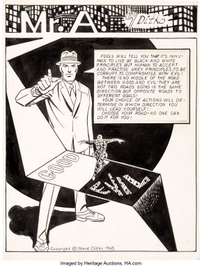Ditko was very blunt about how Mr. A was intended to embody the Ayn Rand Objectivist philosophy that the artist and writer embraced. Countless cheap shots yet just as many legitimate criticisms get leveled at Ditko and Mr. A because of their devotion to Rand’s principles, some of which Ditko is accused of misrepresenting.