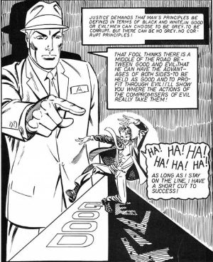 As we’ve seen, Ditko and his character Mr. A believe in black and white morally. Any shades of grey they simple-mindedly dismiss as participating in evil. The white-clad fanatic hounds a man who starts out making small ethical compromises, promising himself that one day he’ll be established enough that he will never have to compromise again.