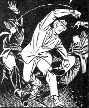 Icer and Krebs beat up Rex Graine and warn him to stop covering their boss or they’ll kill him next time. Rex had to let himself be roughed up to avoid exposing his secret identity as Mr. A if he outfought the thugs.