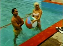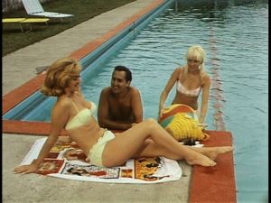 We cut to the estate of a wealthy Canadian family. Neil Sedaka plays Bob, who is cavorting at poolside with his best girl Betty (Linda Christopher), one of the daughters of the wealthy homeowner. Betty is a sexy blonde in a bikini, but her horny boyfriend Bob shamelessly fixates on her sultry older sister Arlene played by her real-life sister Jean Christopher.