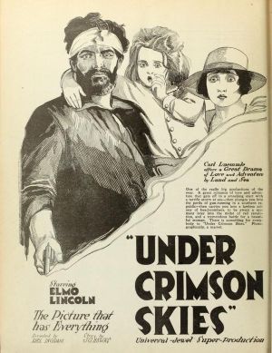 UNDER CRIMSON SKIES (1920) – In this hour-long movie Elmo Lincoln stars as bearded badass Captain Yank Barstow. Yank’s ship has been chartered to transport wealthy Vance Clayton (Harry Van Meter), his wife Helen (Mabel Ballin) and daughter Peg (Nancy Caswell) to revolution-torn Central American nation Puerto Cortes.