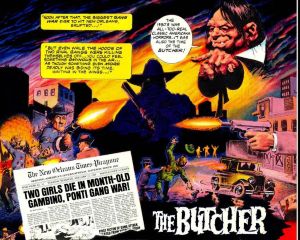By now a full-blown Gang War is plaguing New Orleans with many innocent people dying as collateral damage to the uncaring Mafia families’ conflict. Shotgun and knife in hand, the Butcher stalks the nighttime streets, first killing his attackers – one of them while he’s confessing at Corpus Christi Church – and then waging war on the gunmen from the feuding gangland organizations.