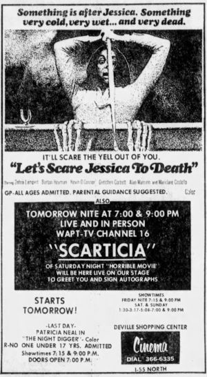 Annette Stutzman made promotional appearances in costume as her Mistress of the Night character during a few showings of Let’s Scare Jessica to Death in 1971.