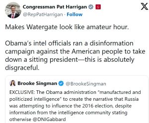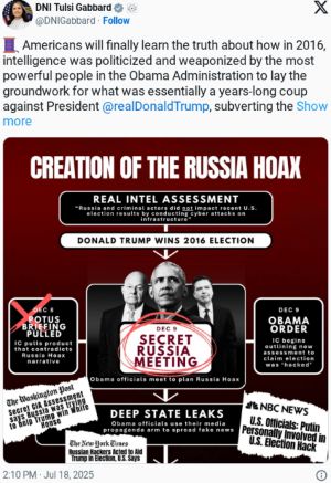 DNI TULSI GABBARD BLOWS OPEN THE MOUNTAIN OF EVIDENCE REGARDING OBAMA AND HIS THREE-LETTER AGENCIES’ RUSSIAGATE HOAX TO TRY CRIPPLING THE INCOMING DONALD TRUMP ADMINISTRATION IN 2016. Plenty of names, facts and dates plus charts which resemble those from Organized Crime trials. Very appropriate for documenting the cesspool called America’s political establishment and for reaffirming what we’ve all known for years.