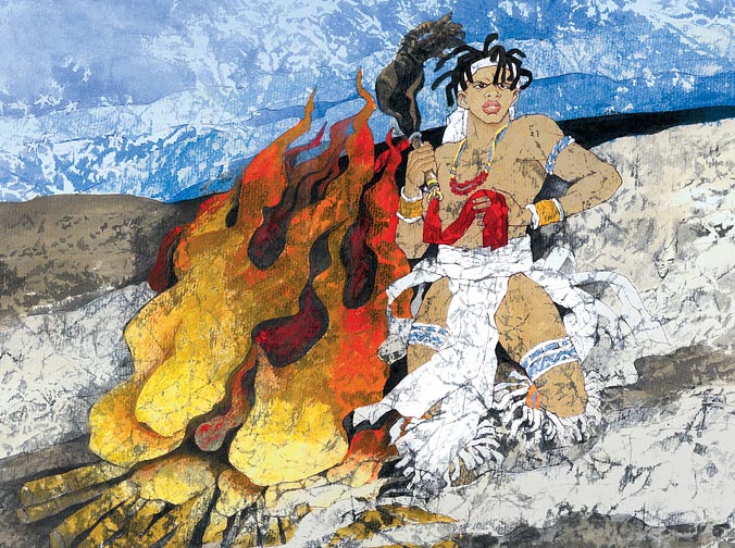 In the restored village of Tubondo, with all the dead brought back to life by Mwindo it was at last time to pass judgment on the captured Shemwindo. In some versions of the Mwindo Epic the semidivine hero sits upon a throne made of spears as if deciding the fate of prisoners of war. Other versions claim Mwindo’s friend Nkuba the lightning god sent down copper chairs for Mwindo and his Aunt Iyangura to sit on while judging the former Chief Shemwindo.
